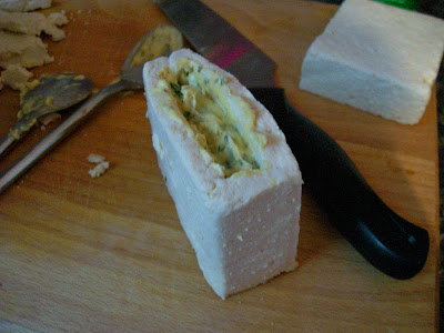 5. Put filling in tofu. Don't overfill it, you don't want the filling to explode the tofu.